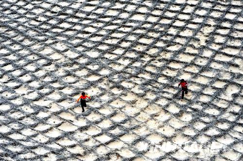 两名小朋友在毛乌素沙地边缘的草方格里玩耍(2009年4月18日摄)。新华社记者 刘泉龙摄