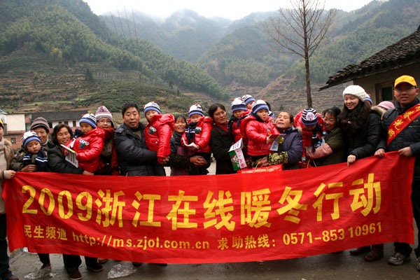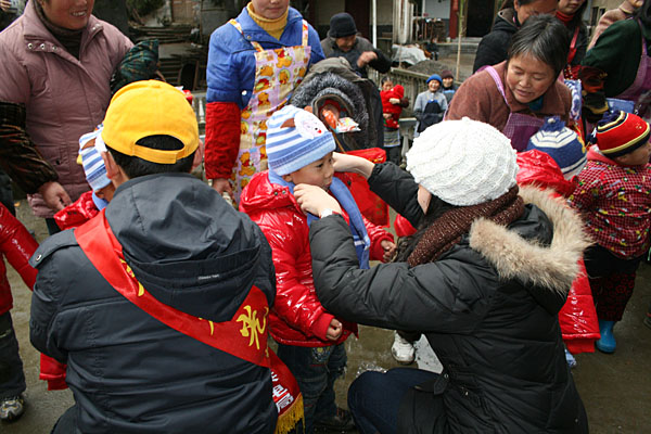 上午9点50分,当大伙到达齐溪镇左溪村时,村民和孩子们已在村口等候了。红扑扑的脸蛋,沾满灰尘的衣服,天真可爱的眼神和表情,这些孩子小的只有3岁,大的也只不过6岁,都是由爷爷奶奶或外公外婆带着,他们的父母亲都在外面城市打工。“帮女郎”和志愿者给孩子们穿上新棉衣,戴上新棉帽和新围巾,并把儿童课外读物、食物发给他们,拿到礼物的孩子们十分高兴,脸上洋溢着灿烂的笑容,纷纷向叔叔阿姨们表示感谢。