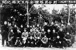 1951年寒假里,我们城内的中小学师生在县文化馆长鲍云鹄的领导下组织起一支配合土改的文艺宣传队 (如图)。 (照片中有刘学敏、金莉萍、王学耘、江月仙、叶安甫等),排练了“王秀鸾” “赤叶河”等歌剧。宣传队到华埠、桐村和许家沅等地配合土改演出,深受贫下中农的欢迎。那时刚解放,农村文娱活动很少,各地附近小山村的老百姓纷纷赶去观看演出。当看到恶霸地主压迫贫农的场景时,台下一片打倒地主反动派的口号声。演出效果非常好,许多妇女看得泪流不止,我们一直演到开学前才结束。当时,我们只教学生扭秧歌,电影也很少看到。只有 “五一”、 “六一”和国庆、元旦才能在城里看到电影。