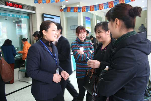 在记者采访朱晓君的两个小时左右时间里,发现她的脚步从来没停过,更别说闲着坐下来喝杯水了。从早晨8时左右,朱晓君忙碌的身影就一直穿梭在大厅里面,一会儿引导顾客填写存、汇款单,一会儿为顾客复印身份证件,一会儿引导顾客上二楼转贷服务区,一会儿安抚产生焦躁情绪的顾客。“微笑是最直接最好的沟通方式。”与每个顾客交流时,朱晓君脸上始终挂着亲切的微笑。