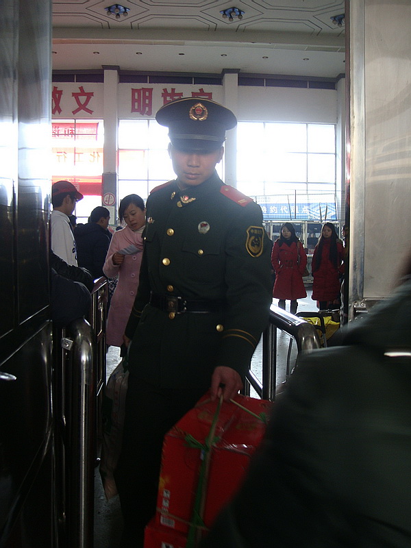 为确保2010年春运安全、稳定、有序、便捷,营造一个良好的乘车环境,正月初五春运客流高峰来临时,县武警中队及时派出武警战士来到客运南站,维护秩序,服务乘客。武警战士们除了在车站执勤巡逻,还扶老携幼,帮助旅客提携行李,被乘客亲切地称为“绿色贴心人”。