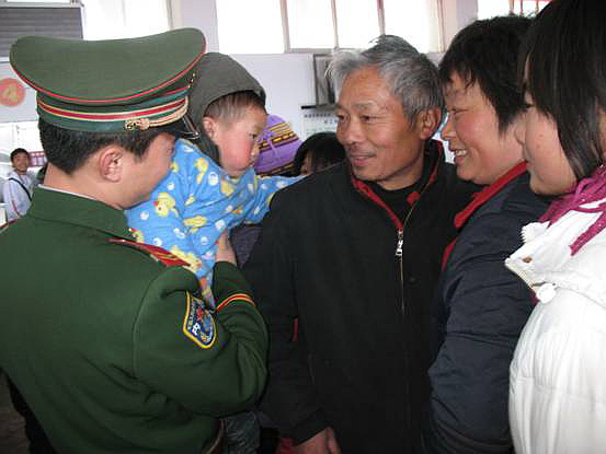 2月21日上午,进出站的旅客川流不息,一位30多岁的女士带着一位两三岁的小孩,手里还提着大包小包,因为站前人流量多,带着许多行李的她在人群中张望,不知所措。正在车站执勤的武警战士小李连忙跑过去,帮助她拿行李,一直把她送上汽车。这位女士激动得热泪盈眶,在车上不停地向武警战士挥手告别。
