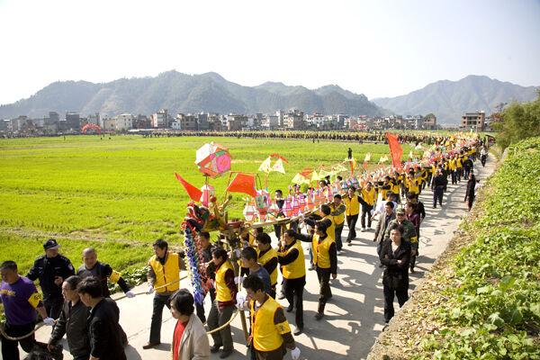 三声铳响,龙出大海,宫灯开行,人群沸腾。腰鼓队、彩球队、民乐队首当其冲,四尊佛像、虎头牌威武开道,五彩斑斓的扛灯队伍,紧随其后,亦步亦趋。在孩子的欢笑追逐声中,在喜庆洋溢的鞭炮声中,长长的宫灯队伍开始沿村间小道,缓步前行。宫灯每到一房,都会有一位德高望重的姚氏长者,在早已准备好蜡烛、猪头、水果等物的香案上,亲自为“龙头”敬酒。走过家门,穿过小巷,充满喜气的宫灯队伍如小河流水般在村中流淌。若好奇,可爬上高处,俯身望去,便会发现一条五彩缤纷的“丝带”,缓缓而行,环绕村中,似乎将幸福和喜庆送到每家每户;若有意,便不用抬头,漫天璀璨烟火,在造就火树银花不夜天的同时,更让人仿佛置身梦中。