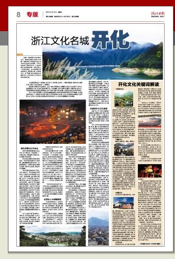 “就像一颗熠熠闪光的绿色宝石,镶嵌在钱塘江的源头;就像一道巍然屹立的绿色长城,成为华东大地的生态屏障。千年古邑积淀下厚重的文化,三省边界融汇成多姿的风情。来这里泡上一杯龙顶香茗,品山肴野蔌,观林涛起伏,赏根雕古趣,忆峥嵘岁月。在“低碳”成为全球热点话题的今天,这里就是人们亲近自然的佳境天城。”这是开化被授予“浙江文化名城”称号的颁奖词。5月13日,记者从有关部门获悉,开化县已正式当选为“浙江文化名城”。