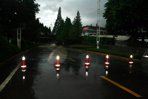 交警设置禁止通行警示路障。