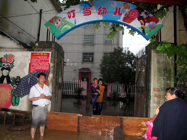 在马金镇,记者还看到街上虽然是洪水,但沿街的叮当幼儿园院子内却安然无恙。“听说涨水了,我们就开始预备了,用挡板把大门给堵上,这样水就进不来了。”幼儿园园长姚小芬说,当洪水满上大街的时候,她们的经验起了很大作用,“我们立即就把孩子们集合在教室里,随时准备往二楼转移。”因为考虑到路上安全,在5时左右,姚园长一边让路近的家长接走孩子,一边告知路远的家长让孩子今晚就住在幼儿园里。