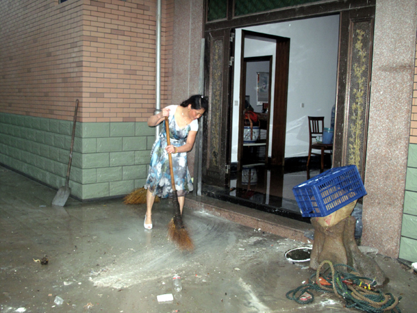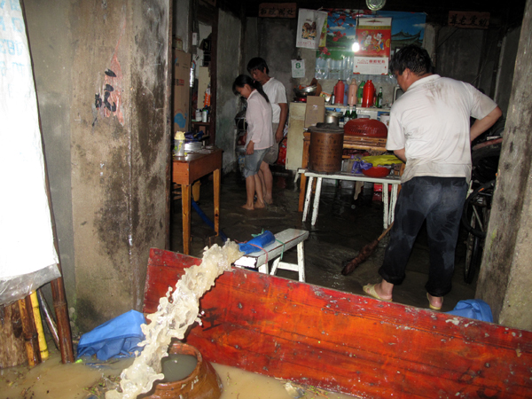 “水是下午4点左右进门的,那时沿街的居民已经做好防御准备了。”在马金老街开日用品店的姚录明说,由于准备较为充分,即使洪水进房了,灾情还是减轻了。与这里一街之隔的下街村在5点的时候已是“水漫金山”,许多人家里都进了水,最深的有50公分以上。“水还没到,我们就开始搬了,可还是来不及啊!”租住在下街村摆烧烤滩的汪殿军告诉记者,由于水来得太快,家里烧烤机、冰箱、洗衣机都浸了水,大米和面粉也糟蹋了许多。由于进水太深,村民姚有明甚至想到了用抽水机往外抽水,无奈还是会有水越过挡在门上的挡板“侵入”他的家中。