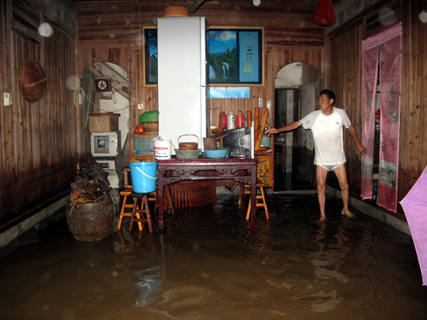马金镇的高韩村由于夹在两条河流之间,洪水到来时,很快就有许多农户家里进了水。为了保证村民的生命财产安全,村主任张丙根在洪水刚刚来临的时候,就组织了村两委干部和未受灾村民到村里巡逻,帮助那些受灾的村民转移物品。村民张舍难已60多岁,由于家里只有两个老人,家电等物品根本来不及搬,“还好村长他们来了,有4个人帮我,不然损失更大。”张舍难告诉记者,家里的电器保住了,但油、米等物品还是遭受了损失,由于家里水还没有退,村里已经安排他晚上住在村办公楼里。张金寿在水灾中损失了一部面包车,家里的几只鸡也被水冲走了,猪被赶进了卫生间,但他还是感谢村干部,他说,是他们的努力才减少了村民更大的损失。
