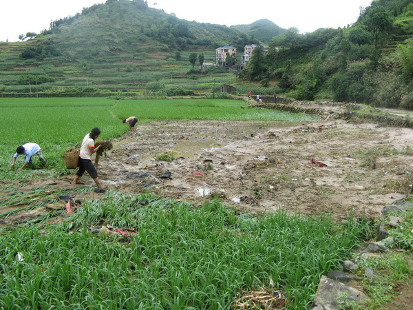 7月9日一大早,塘坞乡东谷村的村干部组织村民们正在进行抗灾救助,有的在田间清洗秧苗,有的清理水渠,有的在修复道路,到处是一片如火如荼抢修水毁工程的新景象。
