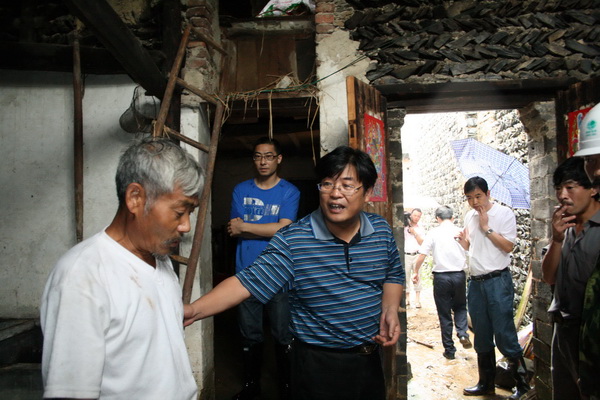 “武川村受灾也很严重!”听了村头镇党委负责人介绍后,金明又马上赶赴该村察看灾情。“暴雨使该村村中央一条河流的河水猛涨,很快漫进了周边的一些农房,进水最高处有近2米深。”金明一面听取村干部汇报情况,一面来到几户进水农户的房屋察看。金明叮嘱乡镇干部及村两委干部,要抓紧组织人员对进过水的农房进行全面消毒,卫生防疫各项措施要落实到位;被水淹过的泥瓦房、土木房存在安全隐患,要及时做通农户的思想工作,尽早组织人员转移。金明还来到该村灾民临时安置点,向受灾群众表示慰问,并鼓励大伙儿要振奋精神,齐心协力共同抗灾。