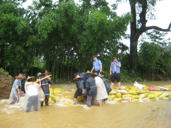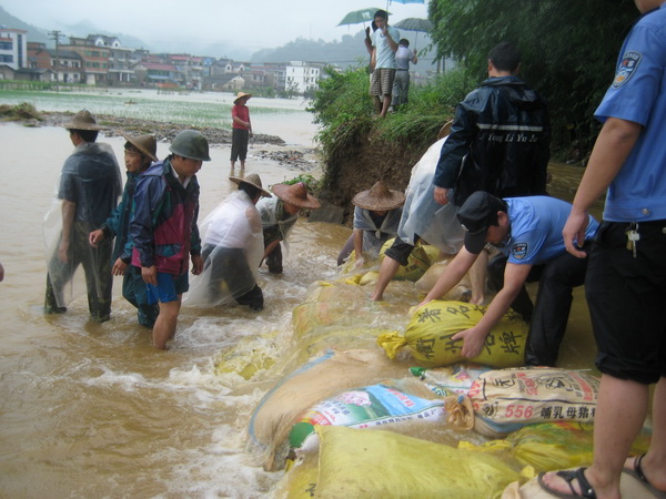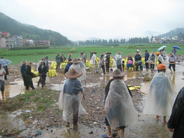 7月9日天蒙蒙亮,400多名党员干部开始着手用沙袋筑建临时防洪堤。截止7月9日下午3时,一条全长30米、宽8米由沙包垒成的临时防洪堤在大伙的共同努力下建成了。