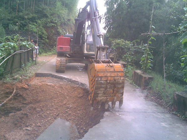 村委会得知情况后,立即在路面上设立警示标志,并邀请上级相关部门来现场勘查。经勘查,认为这一路段需要立即进行处理,否则再遇大雨极有可能引发整块路面的坍塌。村委会立即组织挖机将路面挖开,以防止发生更大的灾难,并临时征用了路边的田地,田地的主人们也积极配合,将自家还未成熟的农作物拔除填平,作为临时道路供行人车辆通过。