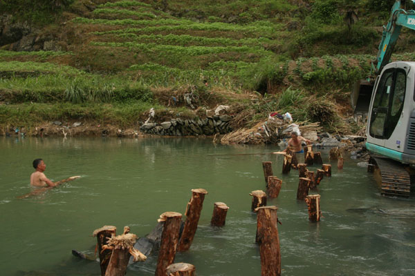 在富林村记者看到,几位村民正在齐胸深的水里打木桩,湍急的河水已让他们的头发都湿透了。“这里原来是个拦水坝,村里的灌溉全靠它的,现在村里500多亩水田没水灌溉,我们正日夜加班希望能尽早修复好。”富林村村支书江国成告诉记者,这个灌溉用的拦水坝在“6•18”洪灾时就已经损毁,这次洪灾之前正在修复中,没想到7月8日的洪水让他们的劳动成果付诸东流。与小河一堤之隔就是富林村的农田,在那里记者看到,由于多日无水灌溉水田里已出现裂纹,灌溉渠里也是干涸得发白。村支书相告,来这里帮忙的村民都是自愿来的,这样减少了村里不少负担。村民江坤玉说:“看着裂开的土地我们都很心痛,希望能搭一把力,早日有水灌溉农田,所以不用村干部动员我们就来了。”