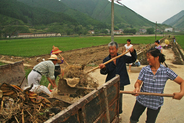 “7月9日,水刚刚退掉,我们村就组织了30余名村民开展自救。”在两次都严重受灾的孔山村,村民们正清理着道路和排水渠里的洪水垃圾,村支书余立土相告,洪水褪去后村里马上组织了自救,把冲毁的河堤加固,以防下一次涨水影响农作物生产,目前清理工作已接近尾声,接下来就是对防洪堤的修复了。