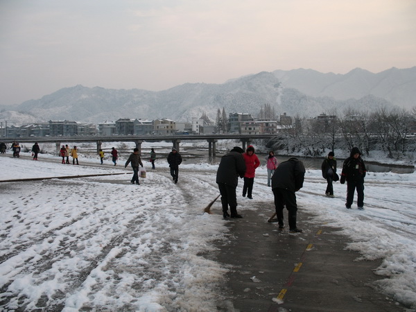 马金市民在清理路面上的积雪(余能宝 摄)