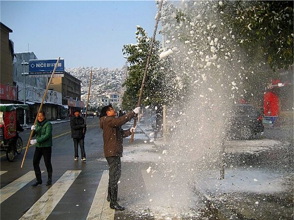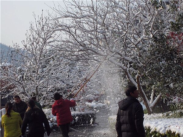 12月17日,记者在开化县玉屏公园内看到,市政园林处的陈师傅正在用大扫把清除积压在园林桂花树上的厚厚积雪。12月15日的一场大雪使城区园林绿地景观中(玉屏公园、荷花广场、江滨路、芹北路)的树木都挂上了厚厚的一层雪,有些树枝不堪重负,生生折断或掉落枝间。针对这一情况,从12月16日一大早开始,县市政园林处的工作人员便全体出动,对被雪压的树木进行除雪扶枝。经过近20多个小时的紧张忙碌,截至今天上午10时许,树木上厚重的积雪基本清理完毕。