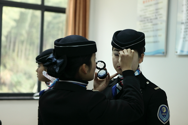 上岗前姑娘们用最美丽的妆容塑造更美好的窗口形象