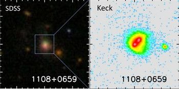 这是其中一个新近发现的“双黑洞”。左侧的图像来自斯隆数字巡天项目(SDSS)。而右侧的图像来自凯克天文台,其分辨率允许辨别出两颗紧靠在一起的活动星系核,它们的强大能量来自黑洞的驱动。