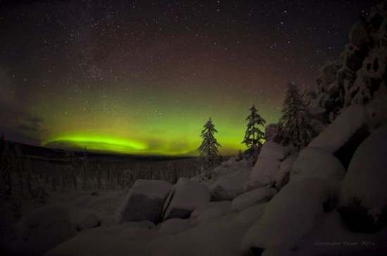 2011年首次北极光:形状奇特犹如外星日落(图) 2011年1月24日 16:09 4.犹如外星日落 犹如外星日落(图片提供:Ruslan Akhmetsafin) 1月8日,形状奇特的北极光使偏远的俄罗斯西伯利亚地区的地平线看起来像是外星世界。大气里的原子类型和它们所处的高度,决定了极光会是什么颜色。人们看到的极光大多都是淡绿色。这是因为这些极光是由位于较低海拔(大约距离地面100到300公里)的氧原子产生的。蓝色和紫色极光是由氢和氦等较轻的气体生成的,较低水平的氮气会使绿色极光幕布的底部形成红色边缘。 首页 上一页 [1] [2] [3] [4] [5] 下一页 尾页 来源:人民网 作者: 编辑:宋晓娟