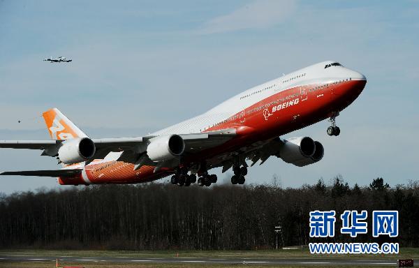 3月20日,一架美国波音公司747-8洲际客机从美国华盛顿州佩因菲尔德机场起飞。当日,美国波音公司的747-8洲际客机首次试飞成功,它是波音制造的最新款客机。波音介绍说,747-8洲际客机在三级客舱布局下可搭载467名乘客,它也是波音在400至500座级客机市场上的唯一机型。 新华社/法新