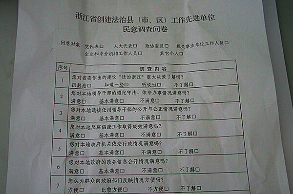 “您对省委作出的建设‘法治浙江’重大决策了解吗?您对本地领导干部的遵纪守法、依法办事情况满意吗?……”3月26日下午,记者在开化县大酒店两会报到大厅里看到,今年参加县八届五次会议的政协委员和列席人员在现场办理好会议报到事项后,都增加了一项新的任务,那就是认真填写一份《浙江省创建法治县(市、区)工作先进单位民意调查问卷》。
