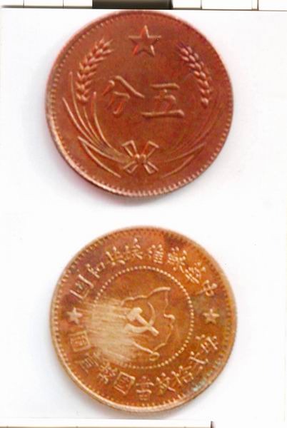 开化县党史研究室就保存有一枚苏维埃铜币的图片资料:铜币正面正中央印有“五分”的字样,旁边是麦穗图案,正上方有一颗红五星;背面正中央是镰刀斧头的旗帜图案,周围一圈刻着字,上方是“中华苏维埃共和国”,下方是“每贰拾枚当国币壹圆”。