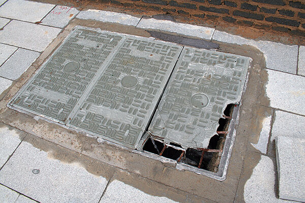 好奇之余,汪女士与同行的家人四下看了看,立时发觉,那股恶臭是从一处破损的长方形窨井盖下散发出来的。
