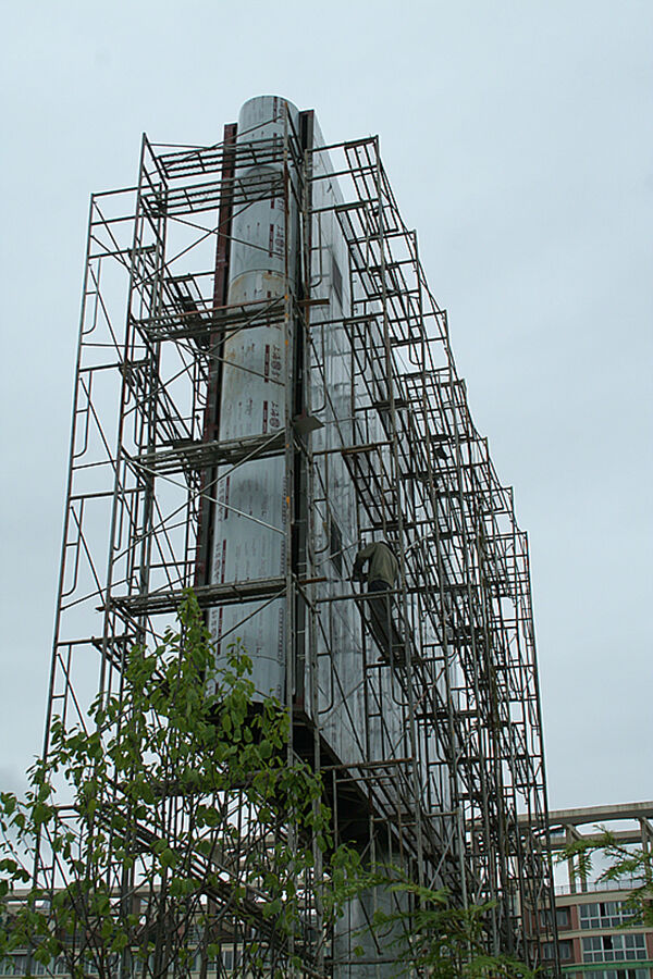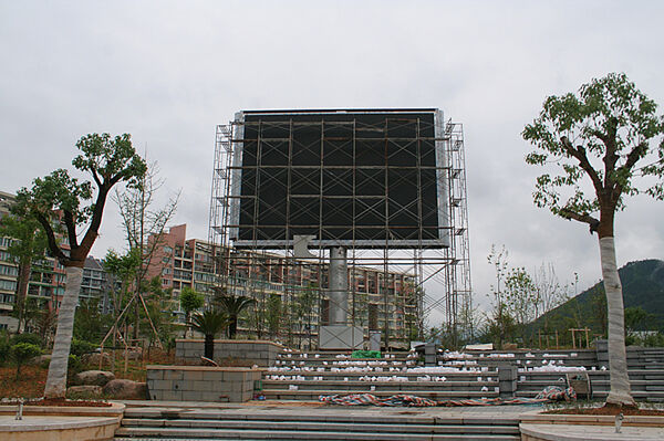 5月23日,记者在开化县南湖公园看到,三四名工程技术人员正在近10米高的铁架上安装LED户外大型电子显示屏。