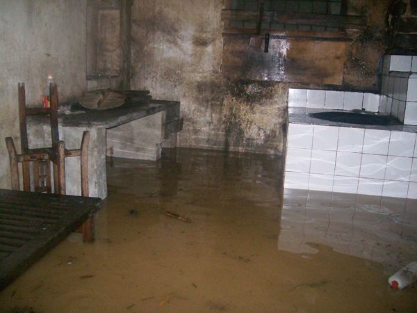 在联盟村村口,洪水已经上了路面,一些车辆都停在了路边,不敢前行,沿路村民的房屋都已进水。记者走进村中,看到村民吴大妈正用塑料桶将水从屋里排出。吴大妈告诉记者,早上一起来,突然发现整个厨房、堂前全是水,从早上7点钟就在这里排水了,现在饭也没地方做了。看着被淹的房子,吴大妈有些无奈。