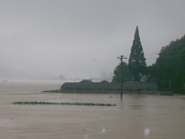 在旭日村,记者看到村庄的大小弄堂都已积满了深水,道路两旁的农田早已是一片汪洋。村干部告许我们,村里地势低的房屋都已经淹到大门顶了,有一大半村民的房子进了水,好在转移及时,没有人员被困。房屋处在旭日村地势较高的村民徐彩花告诉记者,早上7点不到厨房还没进水,7点一过,洪水突然冲进厨房,半个小时不到,两间厨房就积了60公分的水。离开旭日记者正准备赶往大郡村时,发现已找不到去大郡村道路的方向。