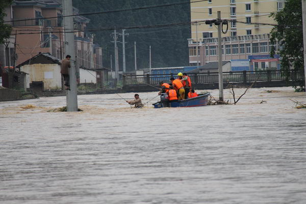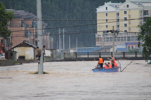 14点30分,救援冲锋舟被抢运到现场,由于水流异常湍急,加之水下情况复杂,救援队员只能跳入齐胸的洪水中,一步一步把冲锋舟往上游平坦的水面推,经过一番努力,冲锋舟接近被困群众栖身的电线杆,救援队员在上游拉起固定绳,慢慢向电线杆靠拢。这时,上游水势越来越大,冲锋舟一次次靠近,又一次次被推开。时间一分一秒地过去,电线杆上的两人也开始显得体力不支,大家的心再一次被揪紧。