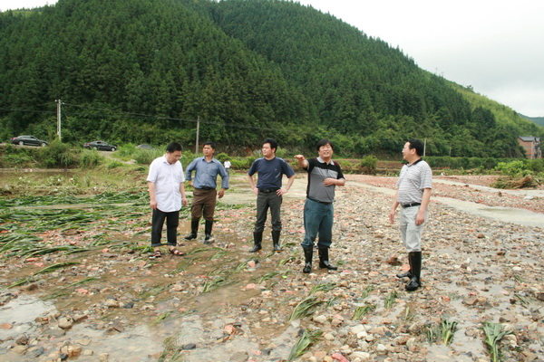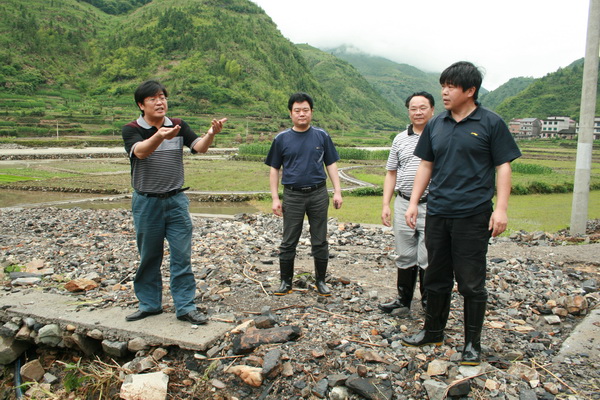 “镇村受灾情况怎样?”“受灾群众的生活安顿好了吗?”一来到桐村镇,金明马上向镇村干部详细了解灾情。桐村镇是此次洪灾中受灾最重的地区之一,全镇9个行政村全部受灾,8000多亩农田受淹,4千多米防洪堤被冲垮,山体滑坡、道路冲毁、村庄被淹、农房进水,灾情严重。