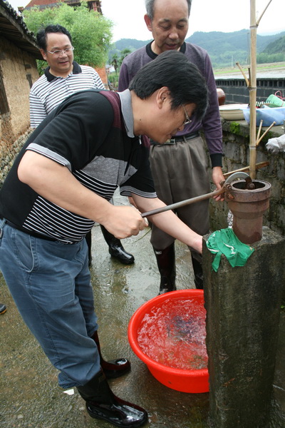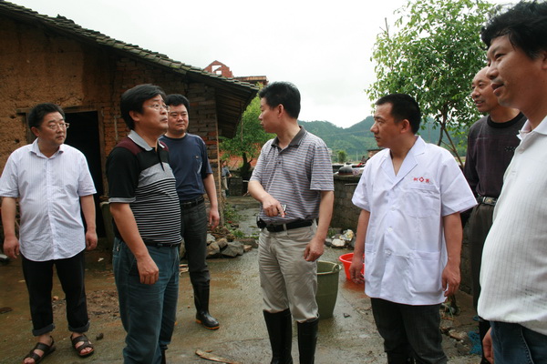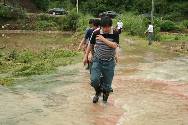 在桐村村施家自然村,金明走进村民施宽兵的家中察看,施宽兵家人正在清扫洪水侵袭后遗留下的烂淤泥。村干部说,洪灾发生时,全村受淹、家家进水,道路被封,屋内水深1米多。“只要大家齐心协力抗灾自救,一定能战胜天灾!”金明一面鼓励村民,一面嘱咐镇村干部要做好受灾群众的转移安顿工作,抓紧组织大家开展生产自救。看到卫生防疫人员正在村里进行消毒防疫,金明要求卫生防疫人员对受灾地区的消毒防疫工作要到点到面,做细做实。