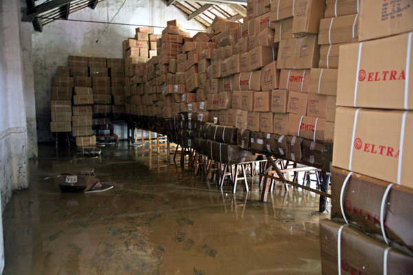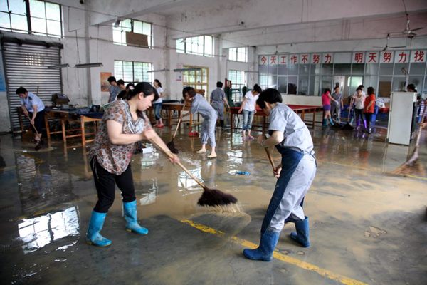 6月16日下午,位于华埠镇下星口地势低洼处的浙江同春工贸有限公司,员工们正在清理受洪灾影响的厂区、车间和五金电器产品,降低损失,争取尽早恢复生产。