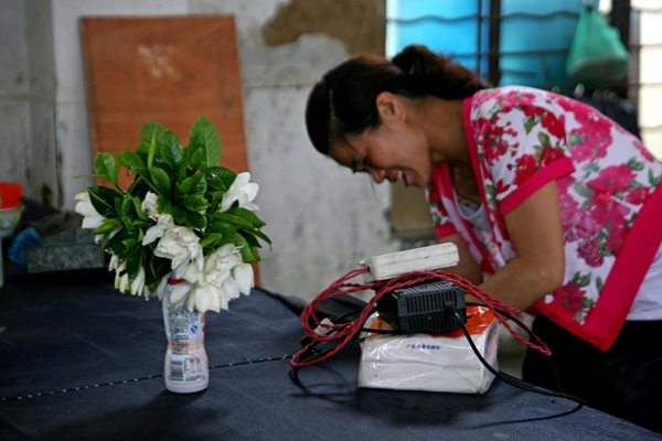 温馨的鲜花摆放在刚遭遇洪灾的车间工作台上