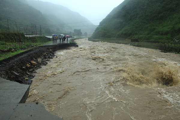 桐村镇桐村村:洪水威胁着道路的安全,村民奋力抢险;