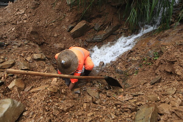 林山乡下江路段,县公路段工作人员在疏通被泥石流堵塞的公路边沟