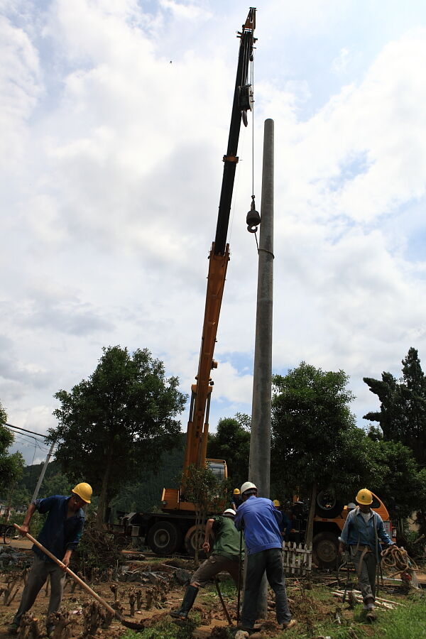 华埠镇华兴村炉庄自然村,供电局工作人员在架立被洪水冲垮的电线杆