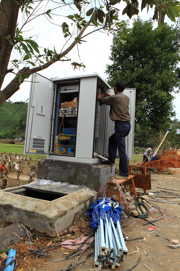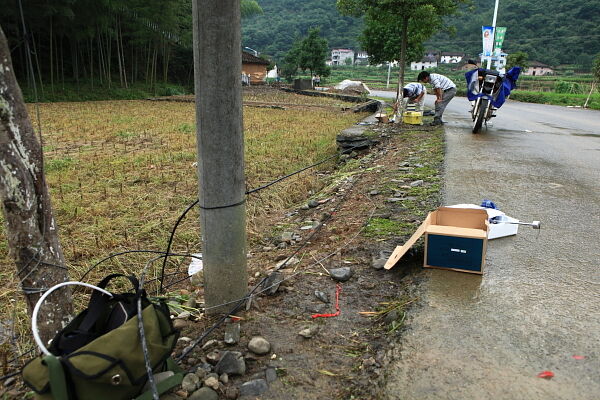 林山乡下江村上汪自然村,广电局工作人员在维修电视和宽带线路