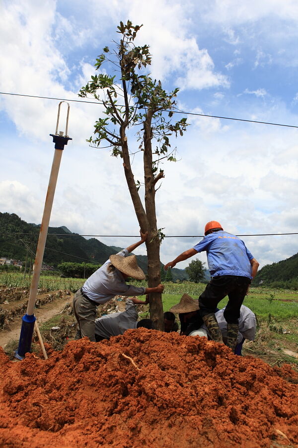 华埠镇华兴村炉庄自然村,村民将村道路两旁被洪水冲倒的16棵行道树重新栽种好