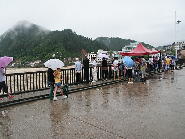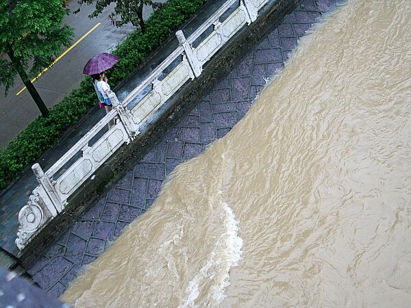 6月19日下午1时30分,第四轮强降水渐止,记者在开化县城芹江一桥上看到,不少市民十分关注这次强降水过程,正三五成群地驻足在桥头两侧,观察芹江里的洪水情况。