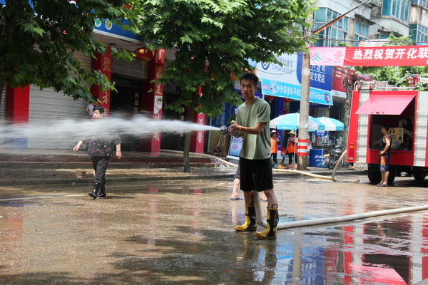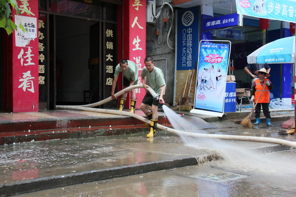 6月18日,洪水过后的第三天,华埠镇老城区街道上的垃圾已经被清理完毕,但洪水带来的污泥仍没有办法完全清除。这一天消防大队的消防车来到了华埠老城区,消防官兵用高压水枪对街面进行了清洗。与此同时,华埠镇再次组织中心卫生院工作人员进行二次消毒,努力做到大灾之后无大疫。