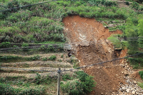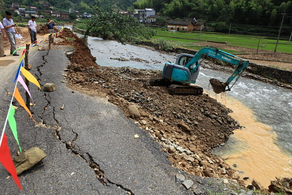 林山乡霞湖村,横卧在半山腰的溪口电站渠道被山洪拦腰截断,塌方长达20多米。本用于电站发电供水和农田灌溉的渠道损毁,将给农田水利带来严重影响。水利局专家组在勘察现场后,和乡政府取得联系,迅速派出挖机和铲车排险。。