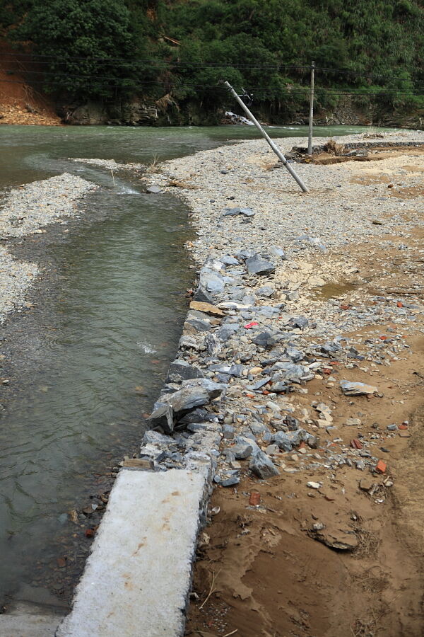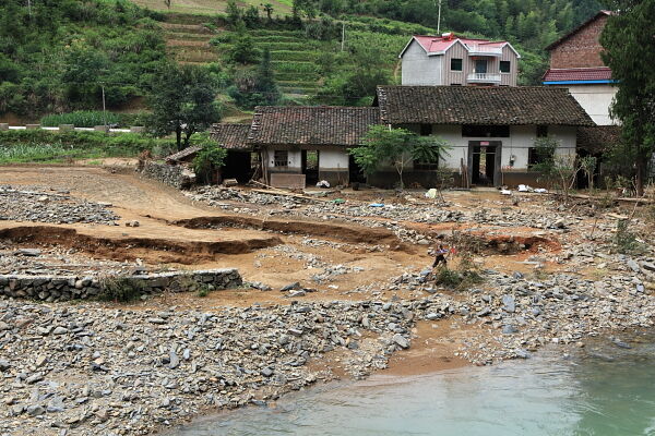 大举村石桥自然村,洪水冲刷的沙石险些将民房摧毁