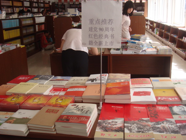 记者在开化县新华书店内看到,该店特意在二楼入口旁设立了“迎接建党九十周年”图书专柜,集中摆放了几十种党建方面的图书,内容涵盖党史、伟人传记、红色经典文学、红歌等题材,专柜吸引了许多选购和翻阅的读者。