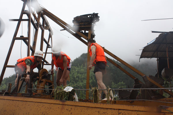 下午2时30分,救援冲锋舟被抢运到现场,由于洪水肆虐异常湍急,冲锋舟无法顺利到达被困人员所在位置。此时,身为现场总指挥的教导员余小红果断决策,随即决定一路想方设法将冲锋舟运送到现场,一路由自己率领两名战士在当地群众的带领下沿着崎岖的山路绕道向现场进发。现场群众根本不会想到,余小红不久前因踝骨碰撞综合症在浙二医院动过手术,医生嘱咐他最少要修养3个月,要杜绝一切剧烈的运动和碰撞,以免对手术创口造成伤害,否则脚踝将难以痊愈。余小红一行四人绕道沿着泥泞崎岖的山路徒步艰难地行走了40多分钟,由于脚踝的伤情折磨,到达现场时已近乎筋疲力尽。但面对已经被洪水困住2个多小时的被困者,他不顾严重的体力透支,当机立断,一心只想尽快将被困群众救上来。