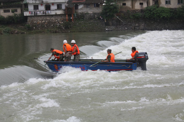 下午1时10分,险情再度传来:城关镇城东灯泡厂路段有2人被洪水围困急需救援。大队立即派出1辆抢险救援车7名官兵前往施救。下午1时20分,在城关镇城东街口因水淹道路、车辆无法通行,原来的公路和稻田都已无法识别,放眼之处都变成了一片汪洋,被困的两名群众紧紧地抱着一根电线杆,由于地方狭窄,他们只能双脚轮换站在上面。距离电线杆一百米远的地方停着一辆白色的面包车,洪水已经快淹到车顶。洪水汹涌,夹杂大量的树木、木板等杂物,人根本无法涉水过河,救援在这里被阻断,指挥员根据现场情况立即向县指挥中心汇报要求调遣冲锋舟赶赴现场。