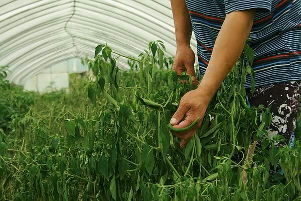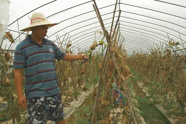 菜农心疼地看着快成熟的黄瓜,黄瓜藤受淹后慢慢枯萎
