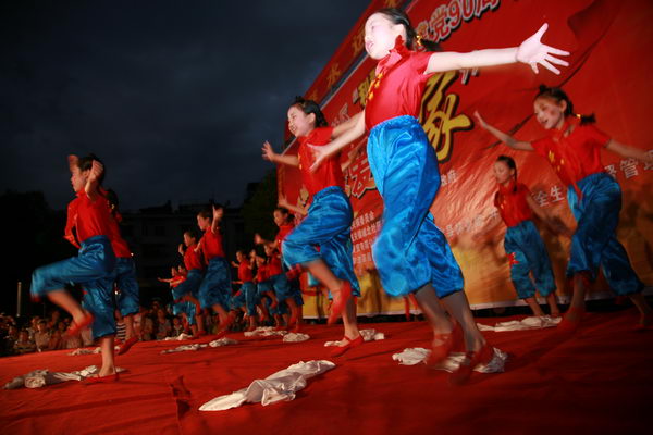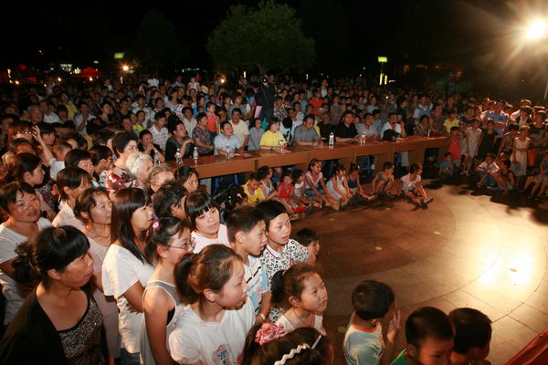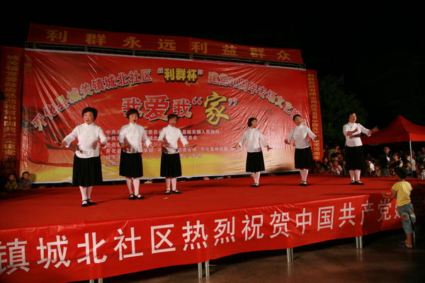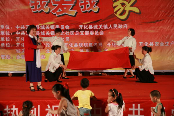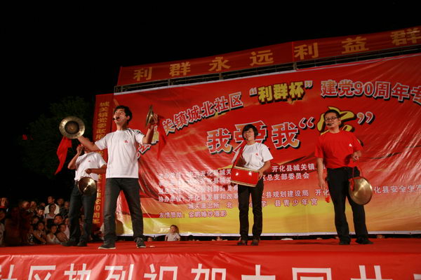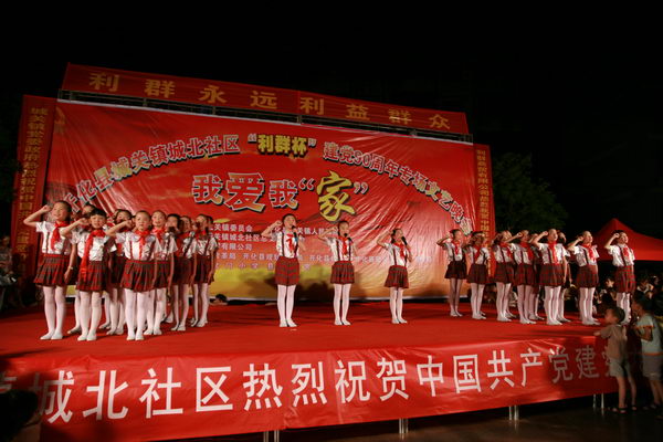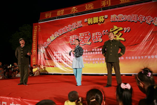 6月25日晚上,开化县城关镇党委政府主办、城关镇城北社区承办的以“我爱我‘家’”为主题的“利群杯”庆祝建党90周年文艺晚会,在荷花广场举行。演出人员饱含深情地表演了大合唱《没有共产党就没有新中国》、舞蹈《学习雷锋好榜样》、越剧《忠魂曲》、歌剧《绣红旗》、诗朗诵《以红领巾的名誉宣誓》、小品《我爱我家》等节目。