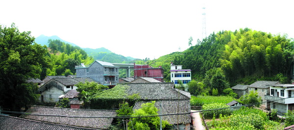 燕溪战斗遗址:解放军战士从左边的山上冲下来,中间为村民房子,右边为布账坑来龙山,远处为九龙岗